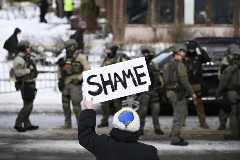 Published 07/01/2026 23:10 A protester displays a sign with the word “Shame” in front...
