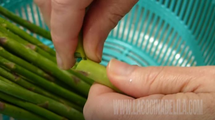 - Ensuite, coupez les extrémités de la tige qui est plus ou moins là où elle change de couleur (vous pouvez le faire avec un couteau ou en pliant avec vos doigts cette partie jusqu’à ce qu’elle casse. les parties dures si vous voulez vous pouvez les enregistrer et les utiliser pour crèmes ou bouillons);