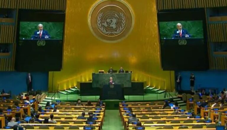 Published 26/09/2025 14:36 | Edited 27/09/2025 09:42 Netanyahu speaks to an empty plenary (Photo:...