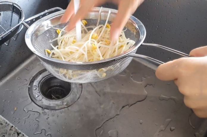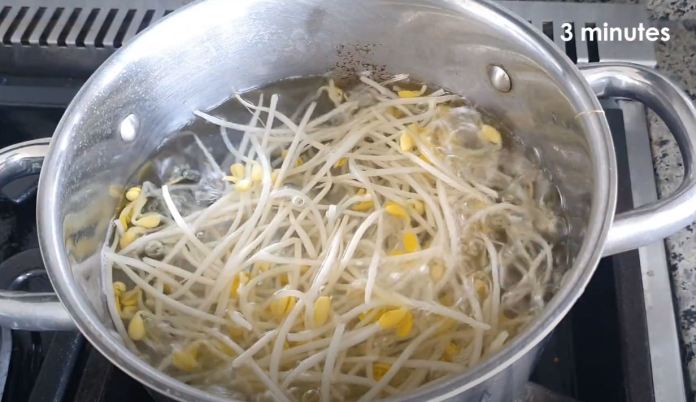 Et ajoutez 1 cuillère à soupe de sel. - Lorsque l’eau commence à bouillir, blanchir les germes de soja pendant 3 minutes et rincer à l’eau froide.