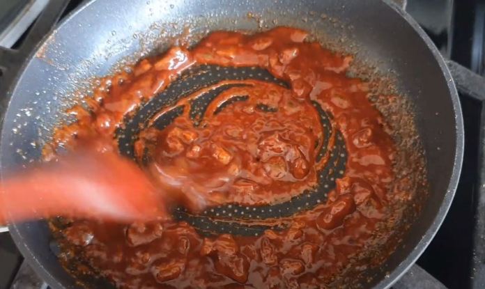Placez la poêle sur feu moyen et ajoutez une cuillère à soupe de bœuf haché et faites-le sauter. - Lorsque le bœuf est presque cuit, baissez le feu à doux et ajoutez une cuillère à soupe de sucre, une cuillère à soupe de gochujang, une cuillère à soupe d’eau, une demi-cuillère à soupe d’huile de sésame et faites sauter jusqu’à ce que l’eau soit complètement partie.