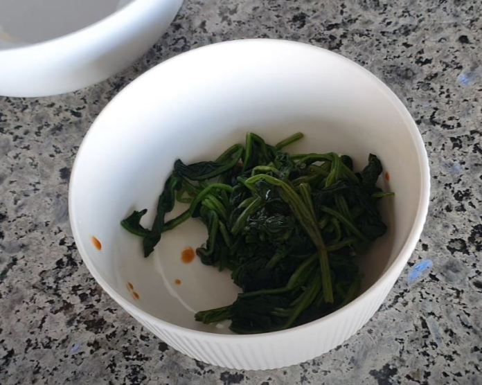 - Assaisonnez maintenant les épinards avec une cuillère à café d’huile de sésame, une pincée de sel et une cuillère à café de sauce soja.