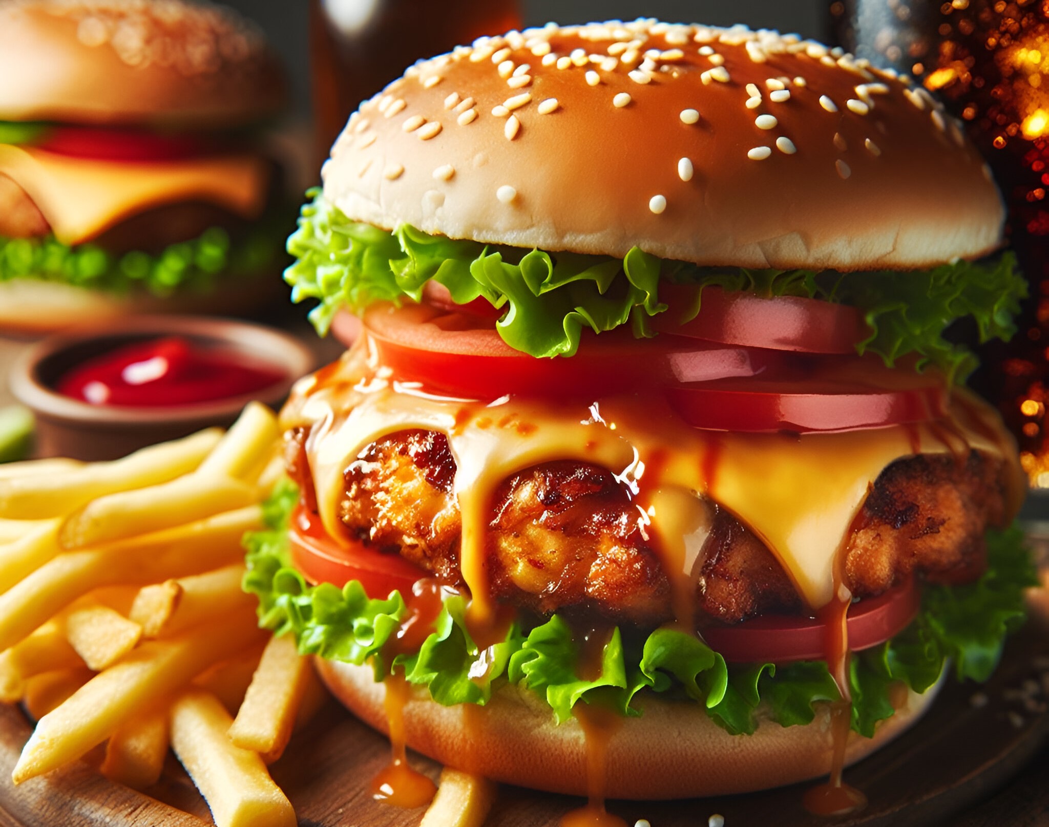 Un burger au poulet est un type de sandwich qui consiste généralement en une galette de poulet hachée ou hachée, assaisonnée et façonnée en forme de burger. La galette de poulet est généralement cuite au grill, à la friture, au four ou au gril. Les hamburgers au poulet peuvent être servis sur un petit pain ou un petit pain et sont souvent accompagnés de diverses garnitures et condiments, comme de la laitue, des tomates, du fromage, des oignons, de la mayonnaise, du ketchup et de la moutarde.