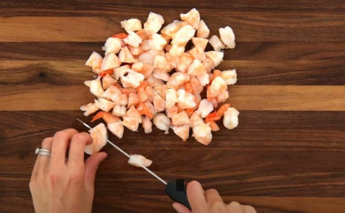 - J’aime utiliser des crevettes de taille 16 à 20 car après les avoir hachées, elles donneront de belles bouchées de fruits de mer, mais vous pouvez vraiment utiliser n’importe quelle taille, assurez-vous simplement que lorsque vous braconnez, vous gardez un œil sur le temps de cuisson pour que les crevettes ne sont pas trop cuites ;
