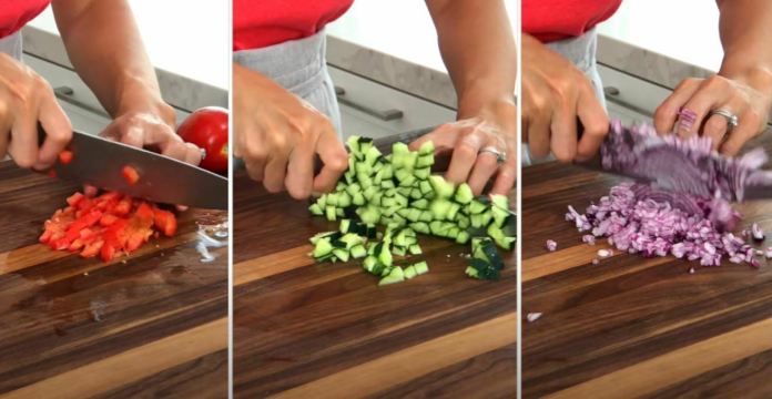 - À une crevette, ajoutez 1 tasse de tomates en dés, 1 tasse de concombre en dés, une demi-tasse d’oignon rouge émincé, deux cuillères à soupe de coriandre hachée, une cuillère à soupe de piment serrano émincé, une cuillère à café de zeste de citron vert, une demi-tasse de jus de citron vert, un quart de tasse de jus de citron et une demi cuillère à café de sel;