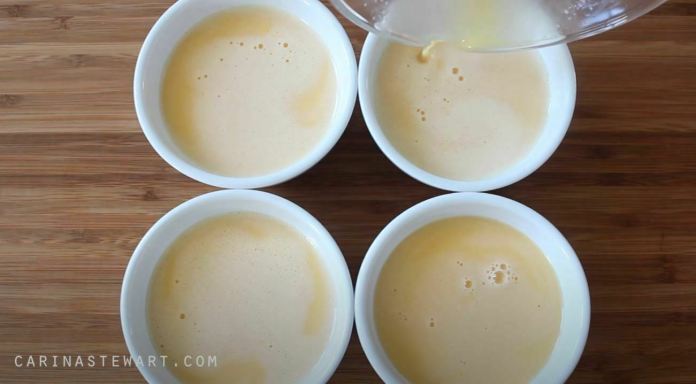 Verser la crème pâtissière dans chaque ramequin, en veillant à ce qu’ils soient tous parfaitement de niveau afin qu’ils cuisent uniformément.