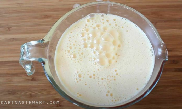 Il n’a pas besoin d’être beaucoup battu, juste assez jusqu’à ce que tout soit combiné et que le sucre soit en grande partie dissous.