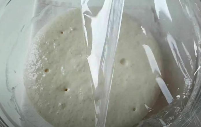 • Dans un bol, ajouter 1 + 1/3 c. à thé (4 g) de levure sèche instantanée + 1/3 C – 2 c. à thé (110 g) de lait (température ambiante) = 2/3 C (80 g) de farine pour le pain ;