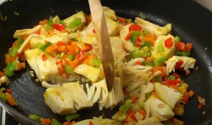 - Laissez grésiller pendant quelques minutes, puis ajoutez les trois poivrons que nous avons hachés plus tôt, ainsi que le jacquier.