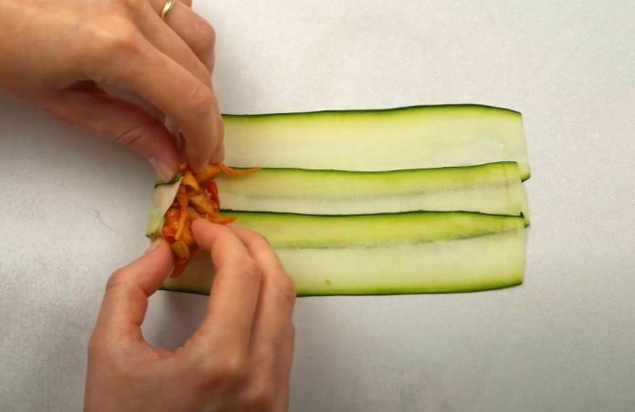 - Ensuite, ajoutez une boule de farce à une extrémité et roulez les courgettes en serrant mais délicatement.