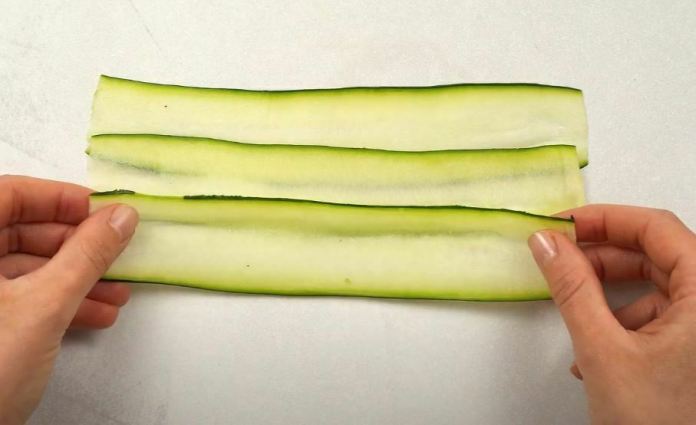 Nous avons utilisé trois tranches par rouleau, et pour faire 16 rouleaux, nous avons utilisé environ trois courgettes de taille moyenne.