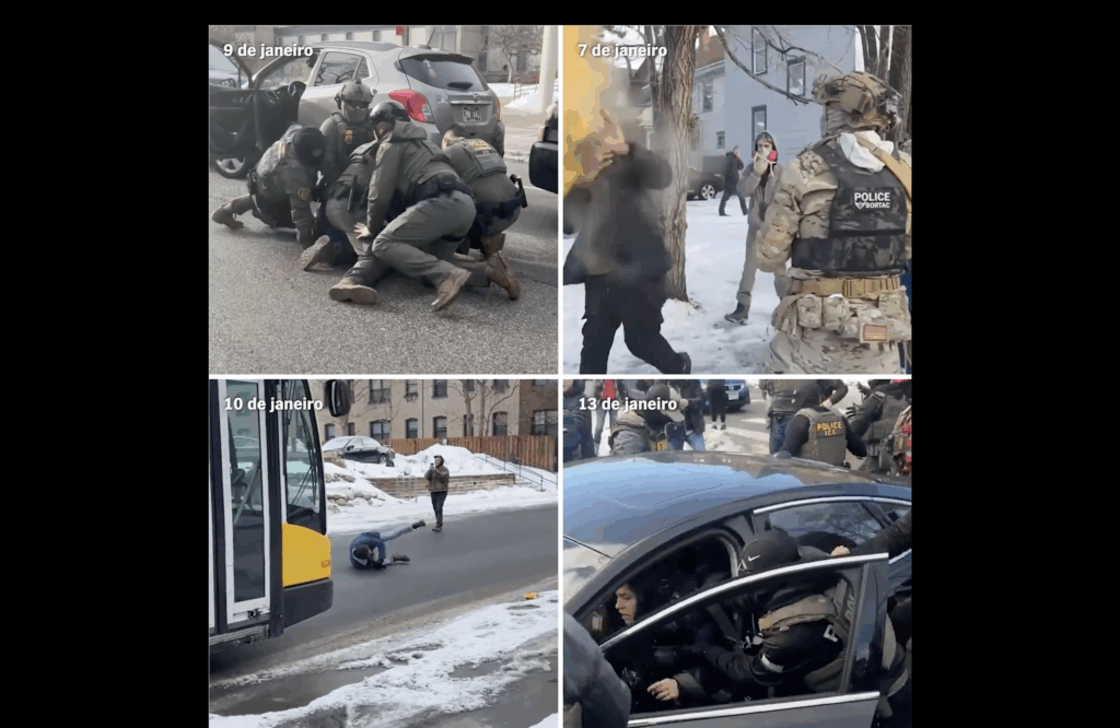Videos recorded by residents and independent journalists in Minnesota have revealed, in recent weeks, a series of aggressive operations conducted by agents from the United States Immigration and Customs Enforcement (ICE). The images show agents breaking vehicle windows, dragging people out of their homes, knocking suspects to the ground and using pepper spray directly in the faces of protesters and detainees. The massive circulation of these records on social media increased public outrage and intensified the climate of fear in the state.