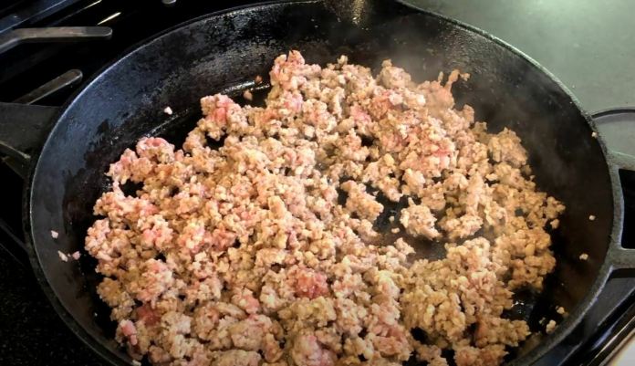 Dans une grande poêle en fonte à feu moyen-élevé, remuez la saucisse pendant la cuisson, en la brisant en miettes de taille petite à moyenne.