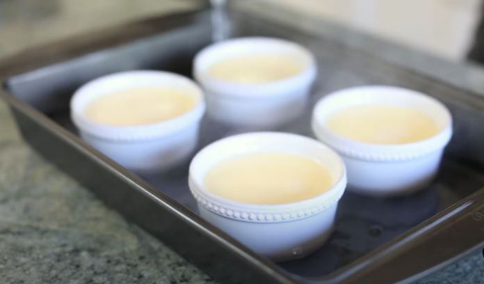 - Couvrir toute la poêle avec du papier d’aluminium, puis cuire les crèmes au four pendant environ 35 à 40 minutes jusqu’à ce qu’elles soient prises mais toujours tremblantes.