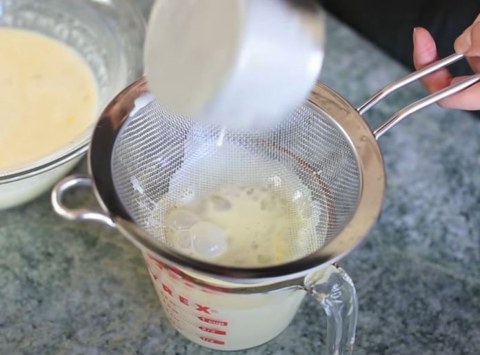 - Les œufs vont laisser derrière eux ces morceaux jaunes globby, nous voulons donc les filtrer.