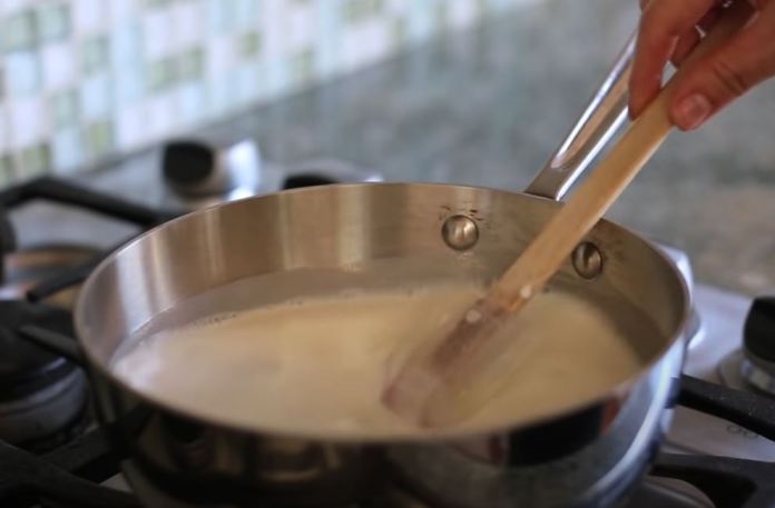- Dans une autre casserole, porter le lait et le sucre à ébullition à feu moyen et remuer doucement pour dissoudre à nouveau le sucre.
