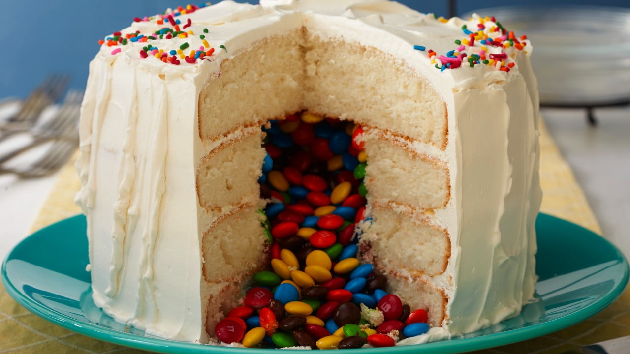 Un gâteau pinata est un type de gâteau creux au centre et rempli de bonbons ou d’autres friandises, tout comme une pinata. Le gâteau est généralement préparé en cuisant deux gâteaux ronds, en découpant un trou au centre de l’un des gâteaux, puis en empilant les gâteaux les uns sur les autres avec le gâteau évidé sur le dessus. La cavité au centre est ensuite remplie de bonbons, de pépites ou d’autres friandises, puis le gâteau est givré ou décoré à l’extérieur.