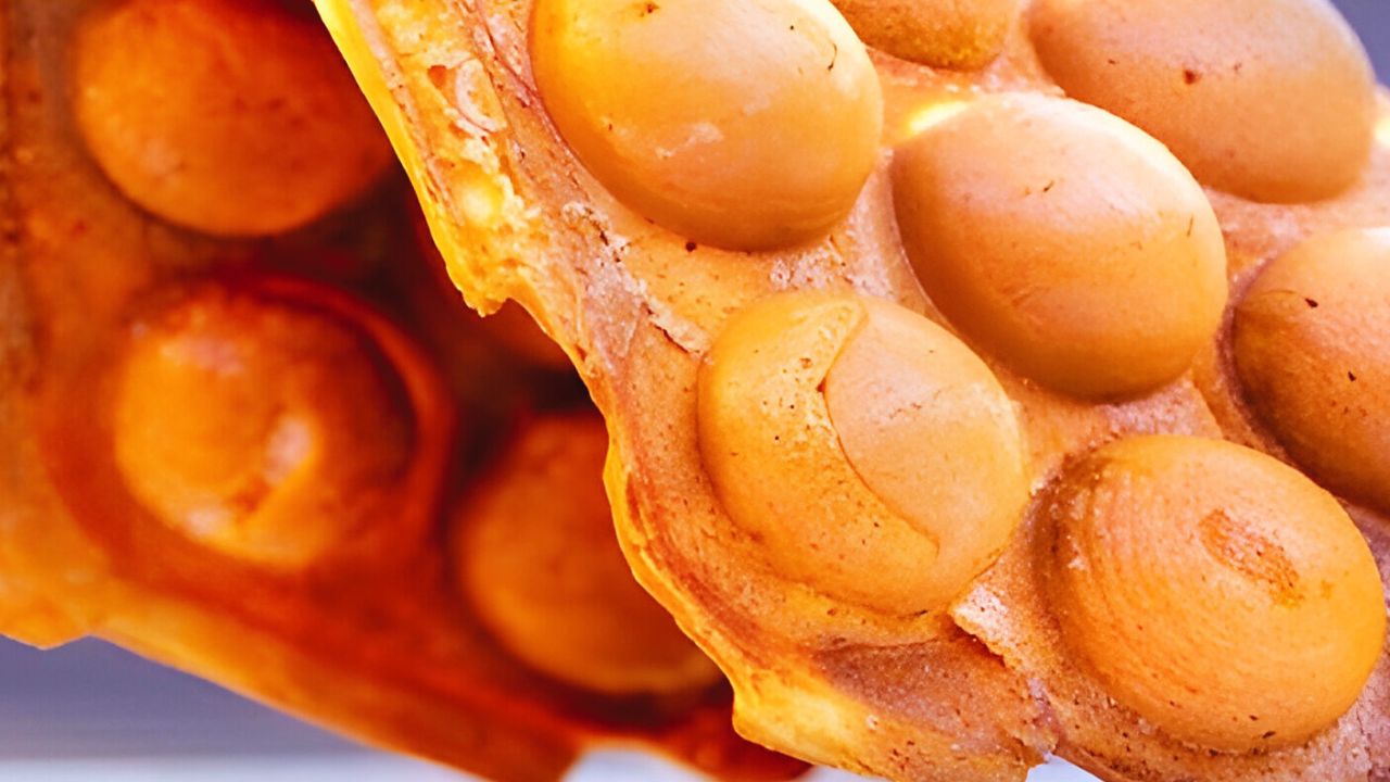 Une gaufre à bulles, également connue sous le nom de gaufre aux œufs ou de puffle, est un aliment de rue et un dessert populaire originaire de Hong Kong. Elle est fabriquée à partir d’une pâte spéciale qui crée une texture unique ressemblant à une grille de poches sphériques aérées, ce qui donne à la gaufre son aspect « bulle » caractéristique.