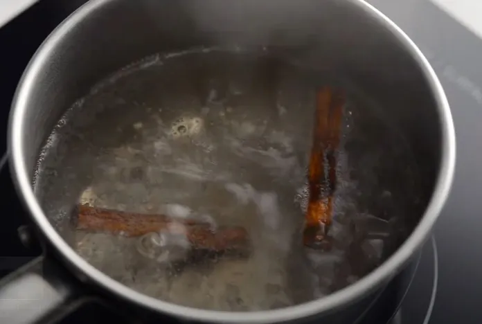 - Faites bouillir l’eau pendant au moins 10 minutes, suffisamment longtemps pour que les bâtons de cannelle soient infusés dans l’eau.