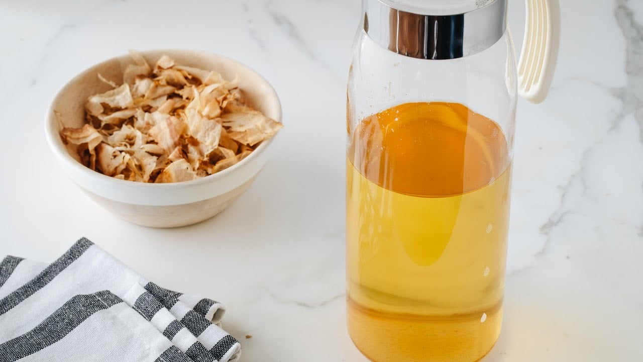 - Filtrer le dashi à travers un tamis à mailles fines au-dessus d’un bol ou d’une tasse à mesurer;