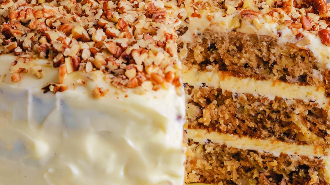 - En option, vous pouvez décorer le dessus du gâteau avec des noix de pécan ou des noix hachées supplémentaires pour plus de texture et de présentation.