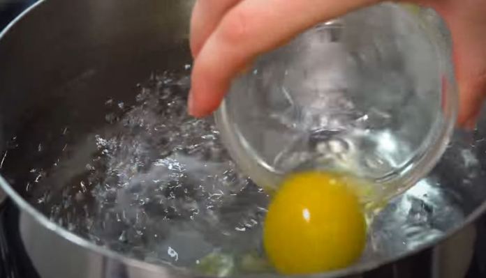 - Vous voulez casser vos œufs dans des bols individuels, verser 1 cuillère à soupe de vinaigre blanc dans l’eau bouillante, puis vous allez prendre une cuillère et faire un joli tourbillon tourbillonnant, puis vous allez prendre chaque œuf et le glisser soigneusement dans l’eau.