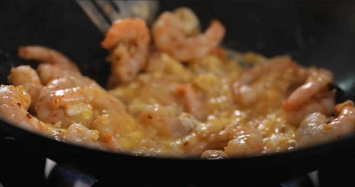 - Viennent ensuite les crevettes en pot cuites avec deux cuillères à soupe de sauce de poisson, une cuillère à café de pâte de tamarin, deux cuillères à soupe de sauce chili douce, une cuillère à soupe de cassonade molle, 2 cuillères à café de pâte de crevettes et 2 cuillères à soupe de sauce soja foncée.