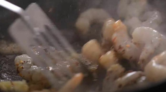 - Maintenant, à l’huile qui a été laissée dans le wok, nous allons ajouter environ 20 crevettes royales décortiquées et déveinées, plus 3 gousses d’ail hachées et une demi-cuillère à café de flocons de piment séché.