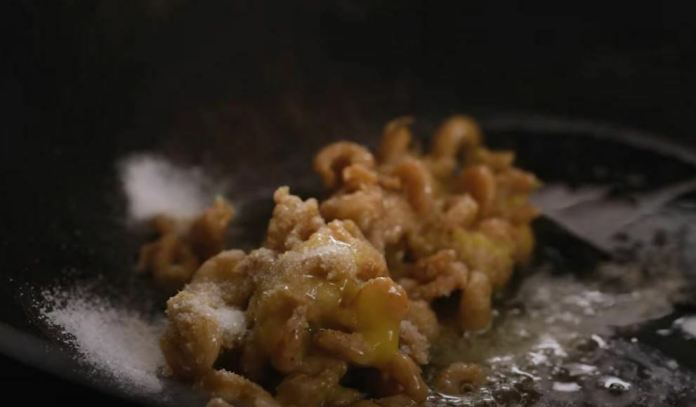 - Faites-les frire pendant deux à trois minutes jusqu’à ce qu’elles soient légèrement dorées, retirez maintenant les crevettes du wok avec une écumoire et placez-les dans un bol.