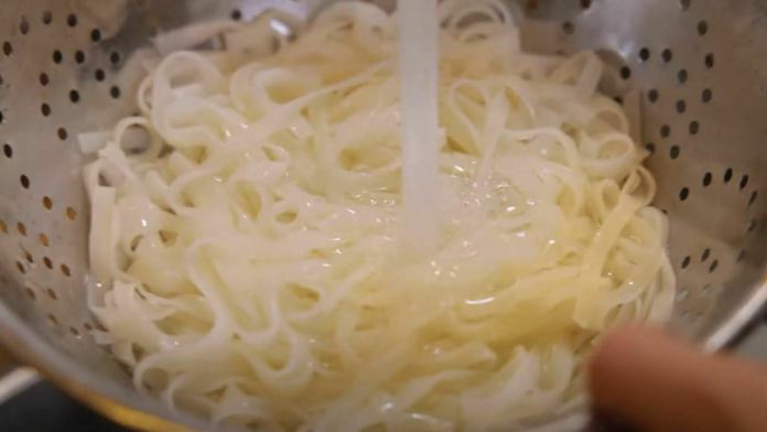 - Je vais commencer par porter à ébullition une grande casserole d’eau et nous allons l’utiliser pour cuire ces larges nouilles de riz plates que l’on trouve dans la plupart des supermarchés.