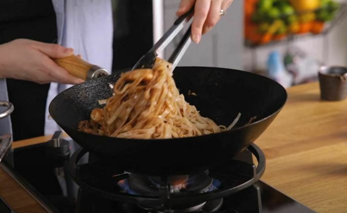 - Maintenant que ces nouilles sont cuites, nous allons réunir toutes les saveurs de ce pad thaï, donc nous allons chauffer le wok à feu vif et nous allons commencer avec 50 grammes ou une once dans trois quarts de crevettes en pot .