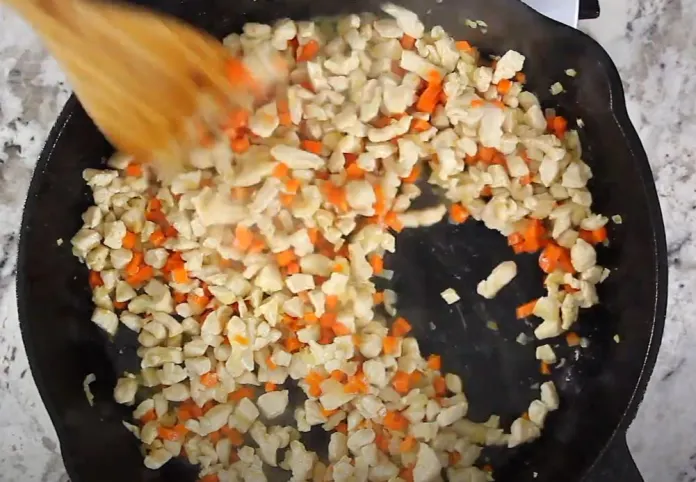 - Ajouter une demi-tasse de carottes hachées dans la poêle et remuer pendant environ trois à quatre minutes.