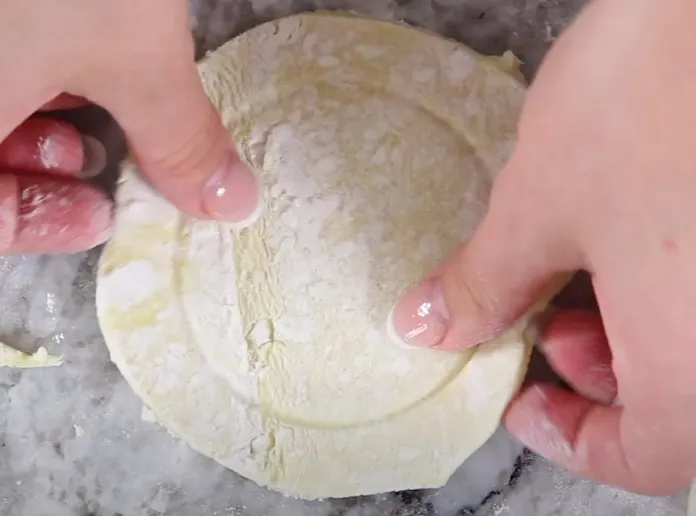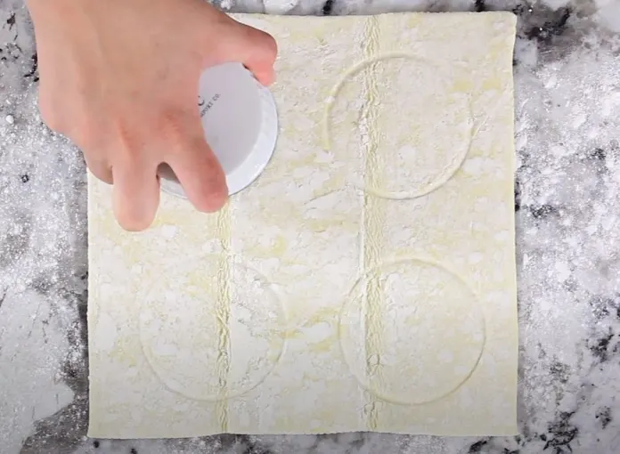 - Maintenant, vous voulez placer votre pâte feuilletée pensée sur une surface légèrement farinée et découper huit cercles.