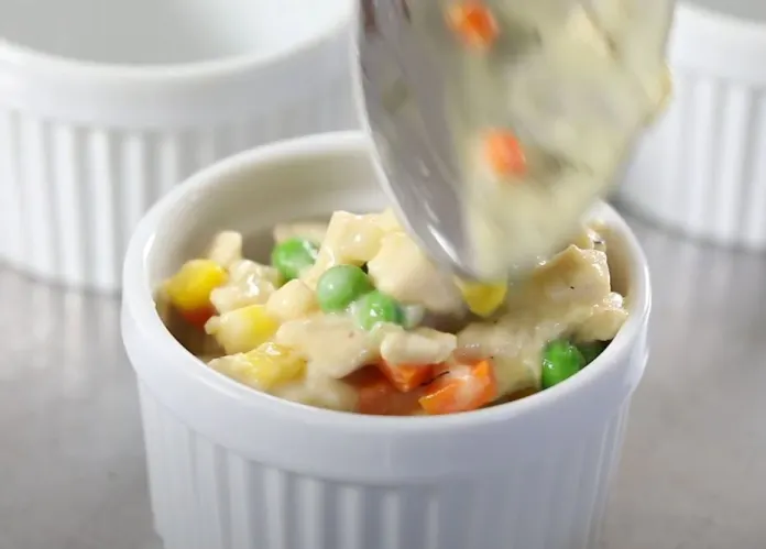 - Sortez huit ramequins de quatre onces et remplissez-les avec la garniture pour pâté au poulet.