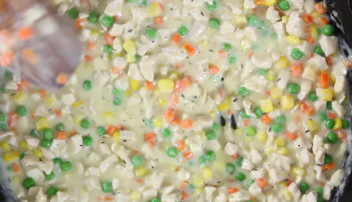 - Maintenant, ajoutez 1/2 tasse de pois surgelés et 1/2 tasse de maïs surgelé, puis laissez mijoter une fois de plus.