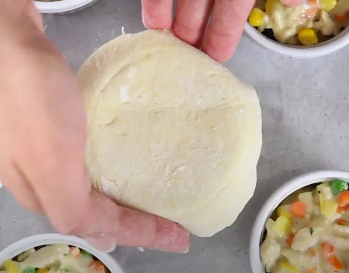 Maintenant, vous pouvez prendre vos cercles de pâte feuilletée découpés et les placer directement sur chaque ramequin rempli.