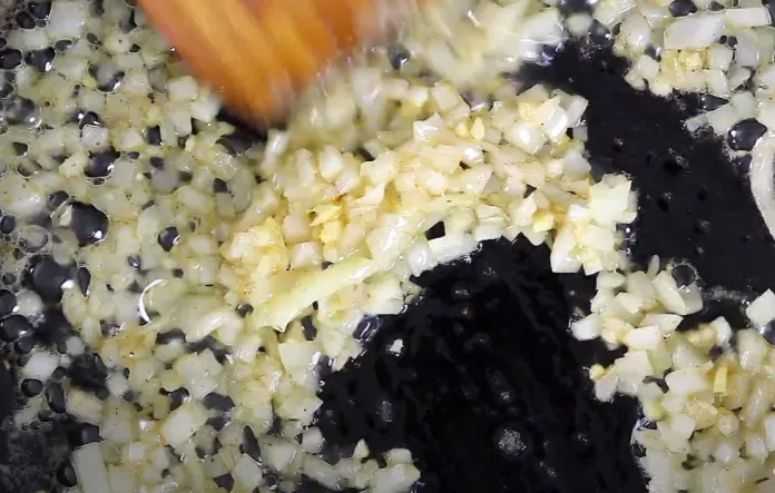 - Ajouter 1/2 tasse d’oignon finement haché et 1 gousse d’ail hachée.