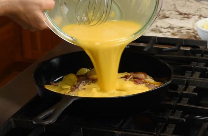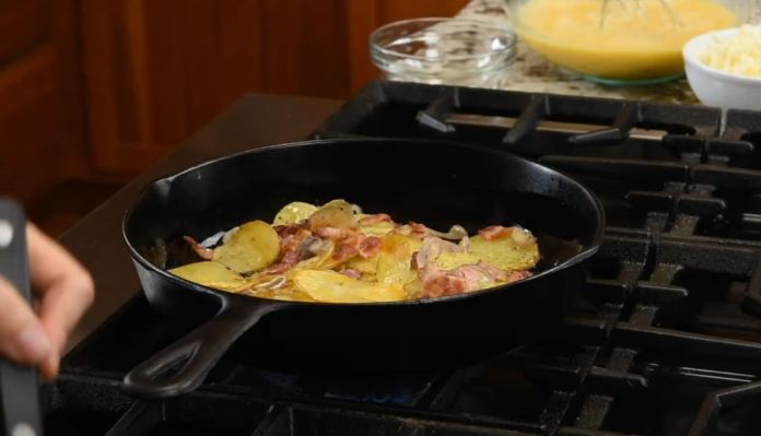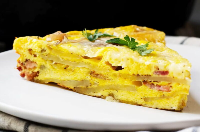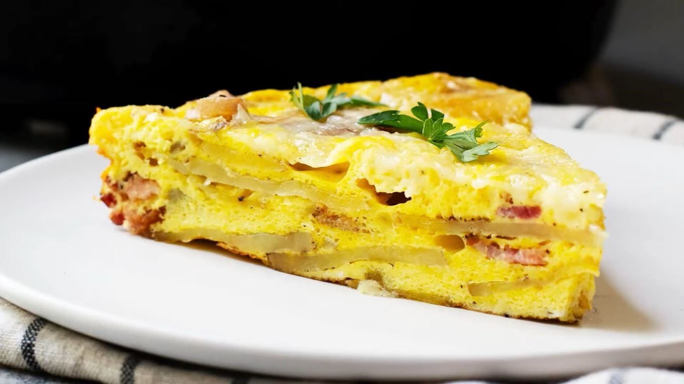 hourLa frittata du petit-déjeuner est moelleuse et au fromage remplie de tendres tranches de pomme de terre, d’échalotes caramélisées et de morceaux de bacon fumé.