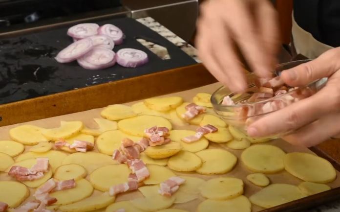 - Vous commencerez par trancher finement les pommes de terre et les échalotes, puis les déposer sur une plaque à pâtisserie tapissée de papier parchemin.