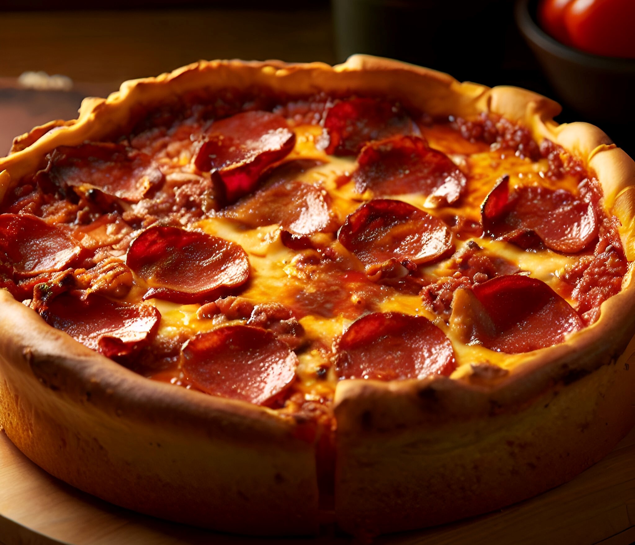 La pizza profonde est un type de pizza qui se caractérise par sa croûte épaisse et pâteuse et ses généreuses couches de garnitures. Elle est originaire de Chicago, aux États-Unis, et est souvent appelée « pizza à la Chicago ». Contrairement aux pizzas traditionnelles à croûte mince, les pizzas à plat profond présentent une croûte à bord élevé pouvant atteindre quelques centimètres de hauteur, créant un «plat» profond pour contenir les garnitures.