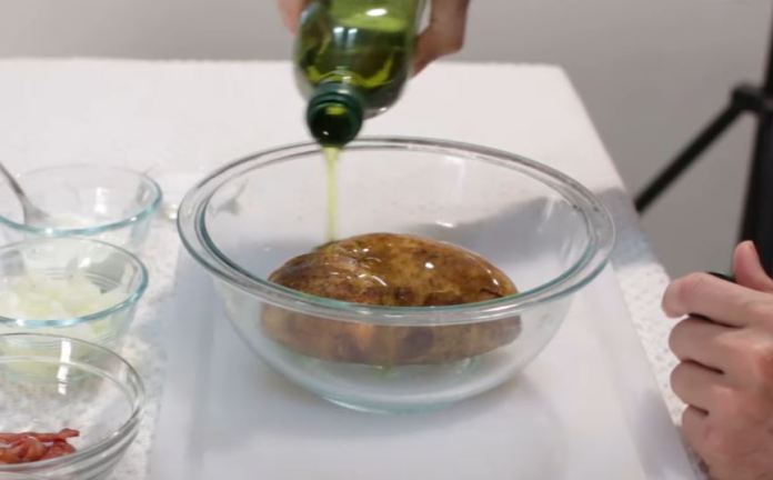 - Et maintenant, ce que nous allons faire, c’est prendre un bol comme ça, puis nous prendrons de l’huile d’olive, ou vous pouvez utiliser de l’huile de canola ou toute autre huile que vous voulez, nous irons de l’avant et en verserons un peu là-bas.