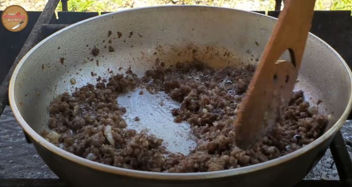 - Dans la poêle huilée, ajouter 300 grammes de bœuf haché;