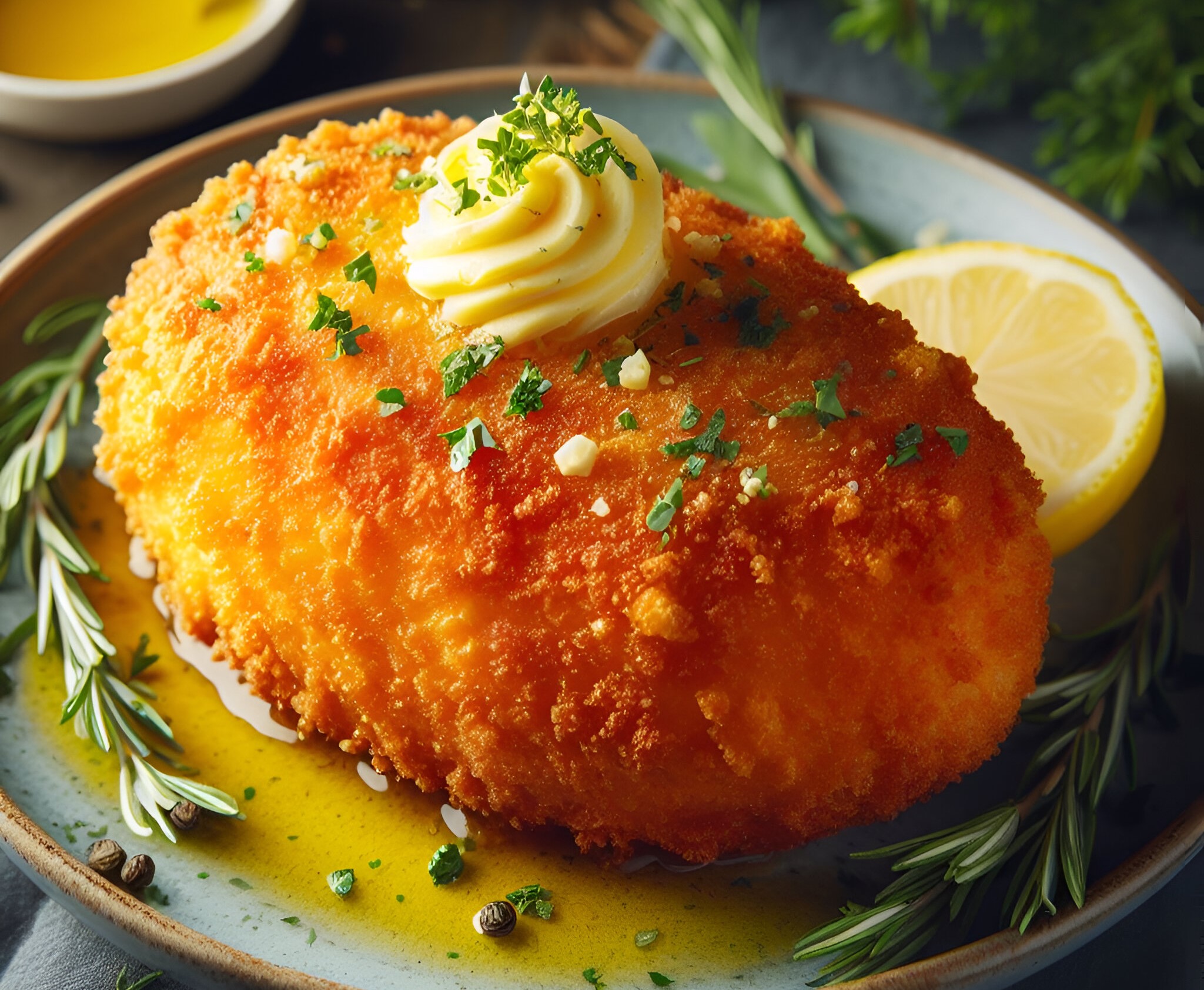 Le nom « Poulet Kiev » vient de la ville ukrainienne de Kiev, mais l’origine exacte du plat fait l’objet de débats. Certains l’attribuent aux influences culinaires russes ou françaises, tandis que d’autres suggèrent qu’il a été créé en Ukraine. Quelle que soit son origine, le poulet à la Kiev est devenu un classique apprécié dans de nombreuses cuisines internationales et est souvent servi avec des plats d’accompagnement comme de la purée de pommes de terre et des légumes.