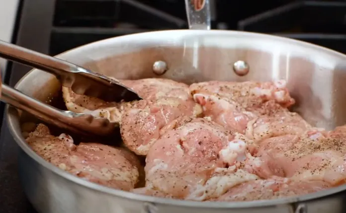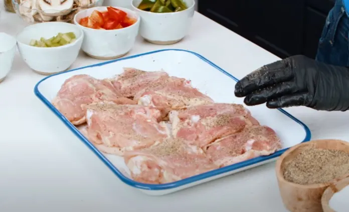 - On va continuer et assaisonner le poulet avec du sel kasher et du poivre noir.