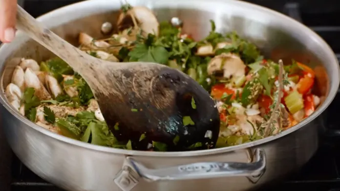 Nous allons couvrir notre casserole et laisser mijoter notre poulet pendant, oh, 25 à 30 minutes, ou jusqu’à ce qu’il soit parfaitement cuit. - Votre Poulet Cacciatore est prêt !