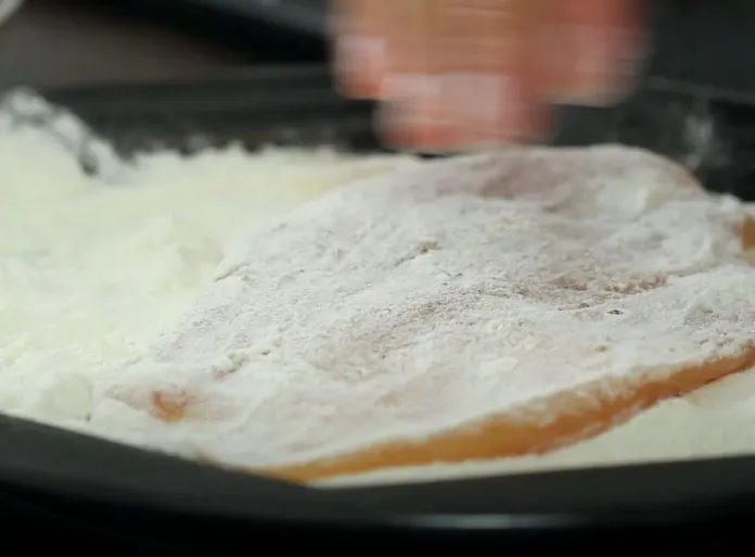 - Tremper chaque morceau de poulet dans 1/3 tasse (40 g) de farine;