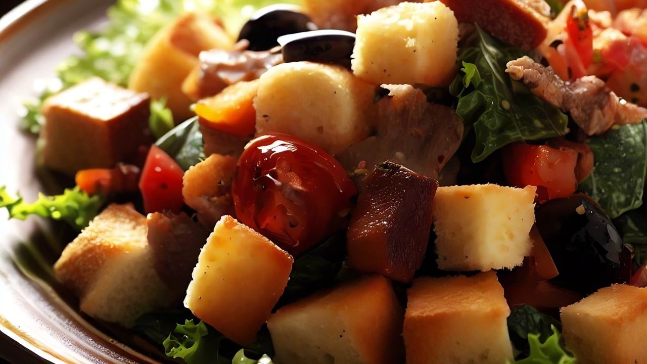 La panzanella est une salade italienne traditionnelle à base de pain rassis et de légumes frais comme les tomates, le concombre, l’oignon et le basilic. Le pain est généralement trempé dans de l’eau ou du vinaigre pour le ramollir, puis combiné avec les légumes et une vinaigrette à base d’huile d’olive et de vinaigre. C’est un plat d’été populaire en Italie et peut être servi seul comme plat d’accompagnement ou comme repas léger.