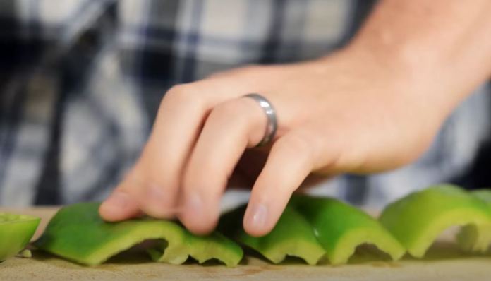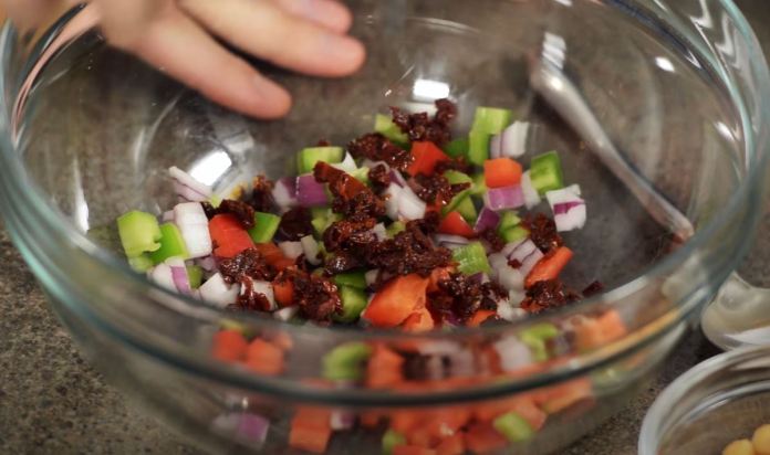 - Et donc, maintenant nous allons couper un quart de tasse de poivron vert, poivron rouge, oignon rouge et environ deux cuillères à soupe de tomates séchées au soleil.