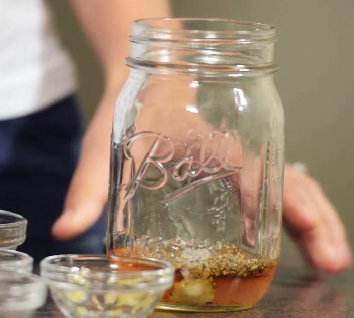 - Maintenant, tout d’abord, nous avons un peu d’huile de tomates séchées au soleil, du jus de citron juste ici, du vinaigre de vin rouge, une gousse d’ail juste là comme ça, de l’origan séché, du basilic séché et une pincée de sel.