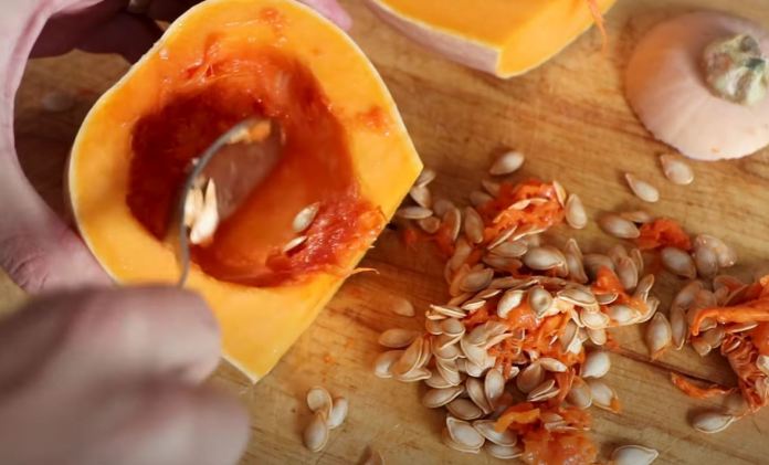 Ensuite, utilisez une cuillère pour évider les graines de la courge.